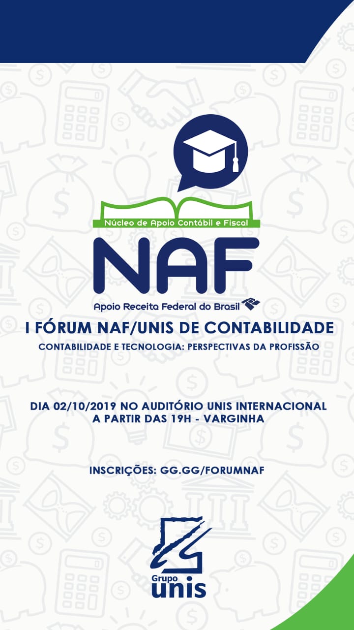 O 1º Fórum NAF/Unis de Contabilidade acontece nesta quarta-feira, 02 de outubro, das 19h às 20h30 no Auditório do Unis Internacional (antigo Hotel Jaraguá).