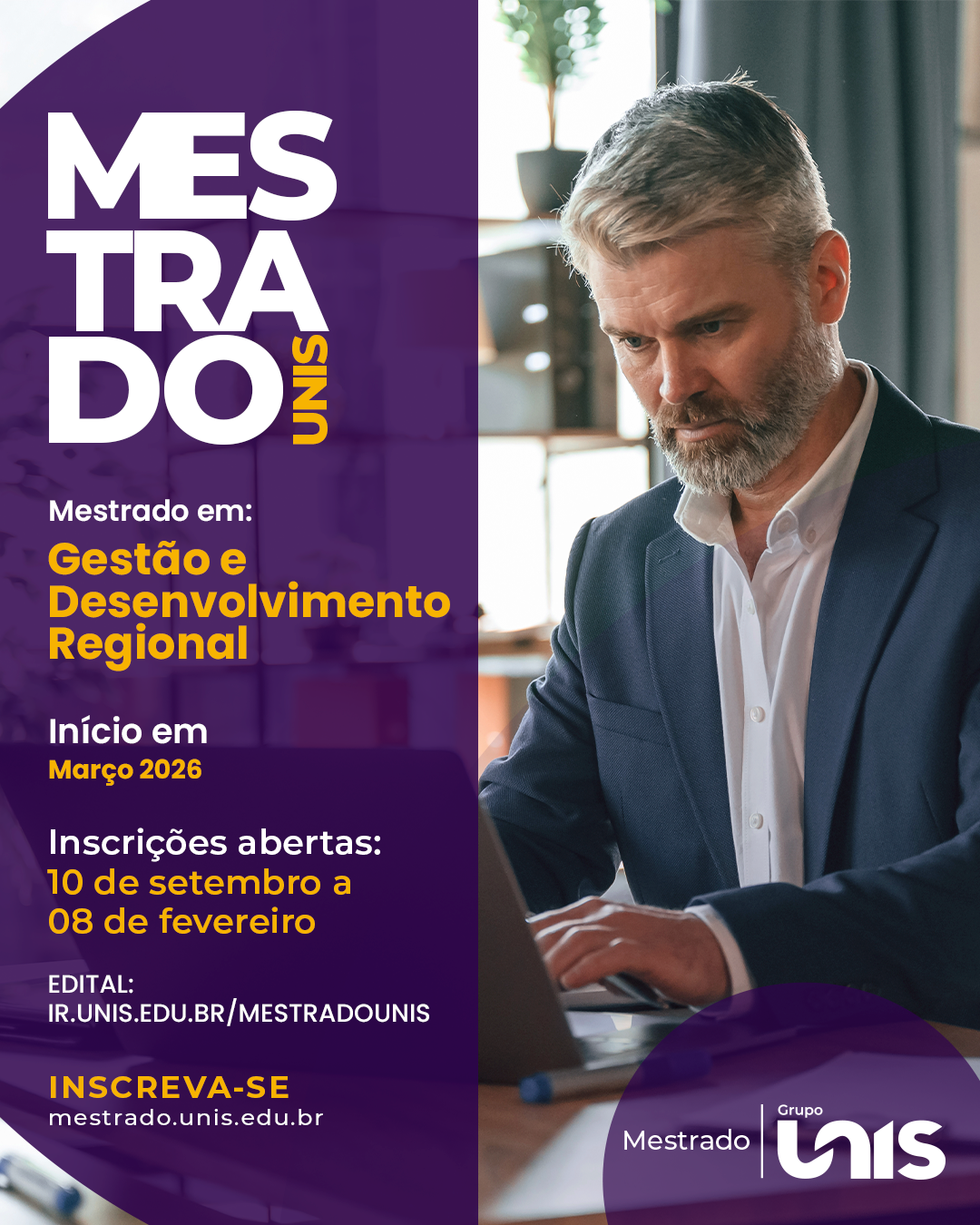 O Grupo Unis está com inscrições abertas para o Mestrado em Gestão e Desenvolvimento Regional, programa reconhecido pela CAPES e único da região com essa proposta. O curso tem como propósito formar pesquisadores capazes de contribuir de forma prática e inovadora para o desenvolvimento sustentável, abordando dimensões econômicas, regionais, sociais e educacionais.